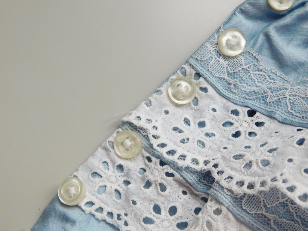 As regards the other side, I made some buttonholes on a piece of fabric, then I applied it. The final result isn’t that good ‘cos the two rows of gathering made some bulkiness.