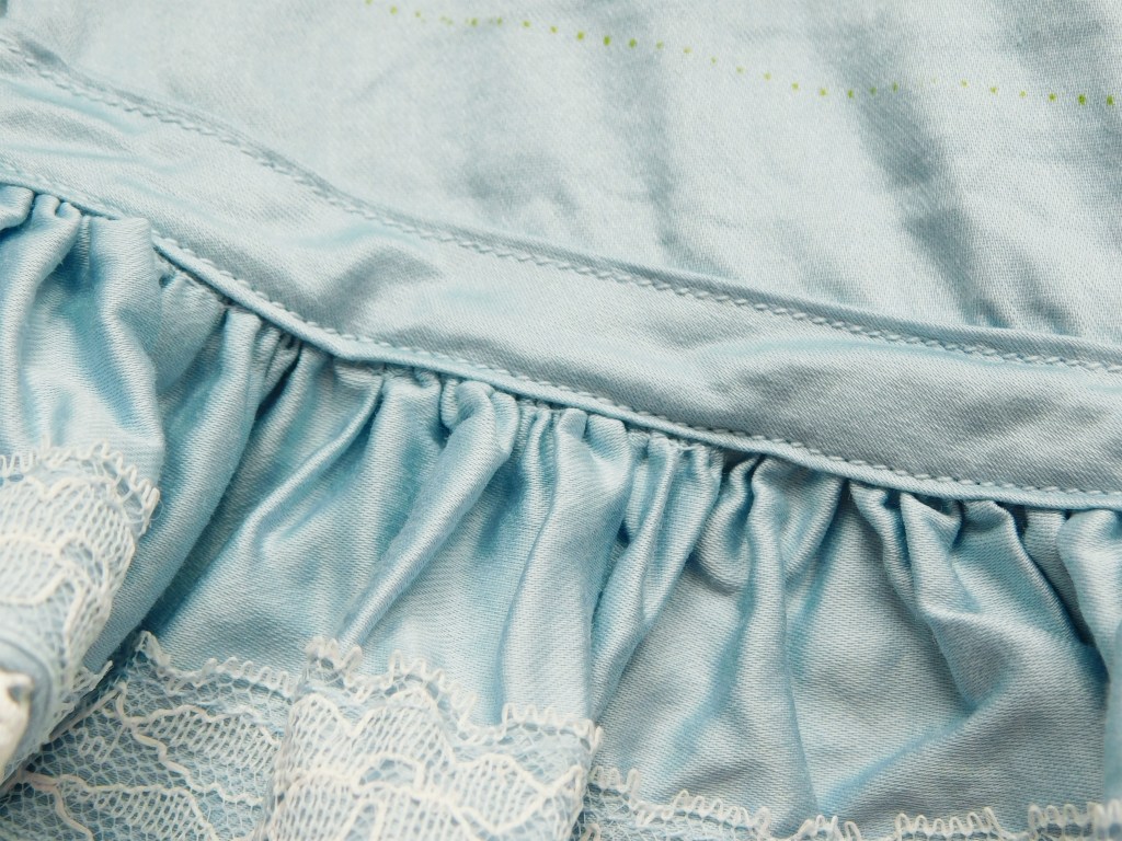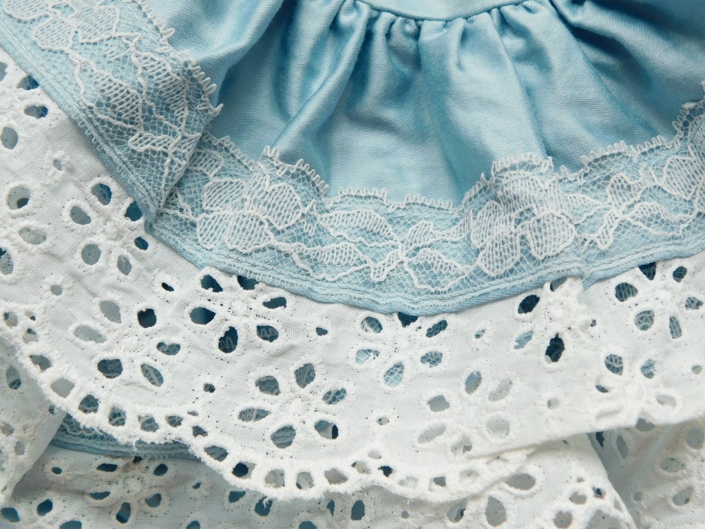 As regards the necessary fluffiness I had to add two rows of gathered strips with two lace trims.