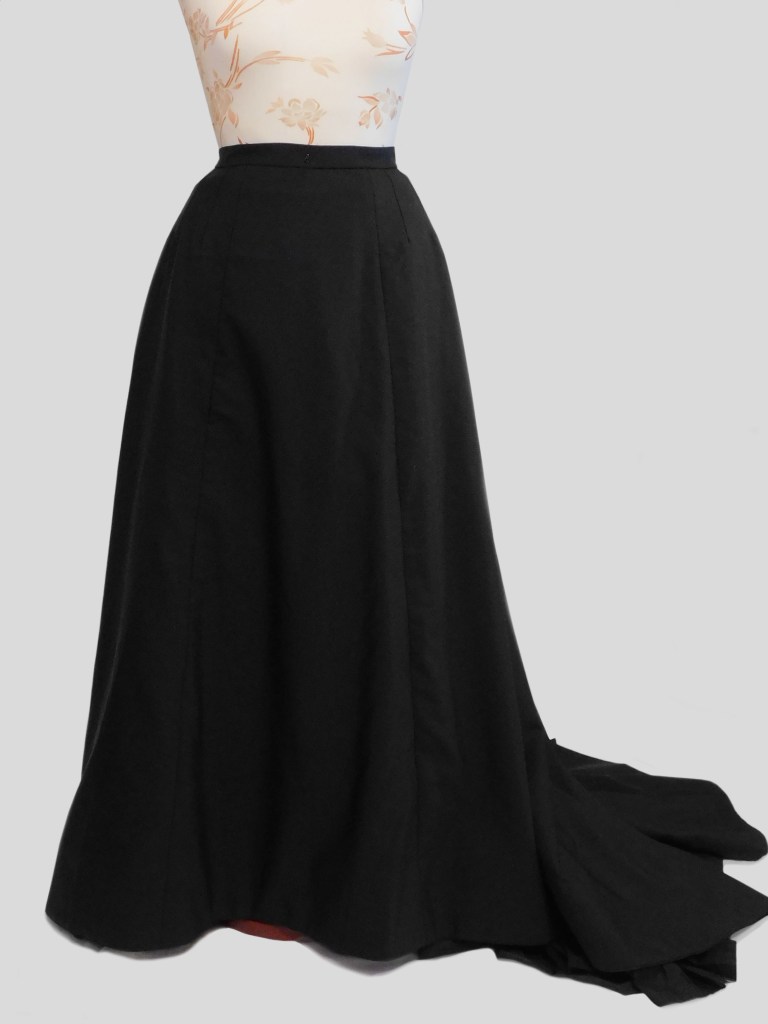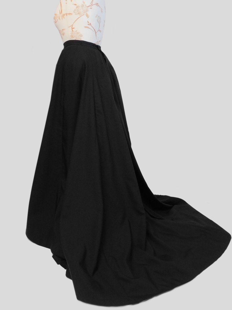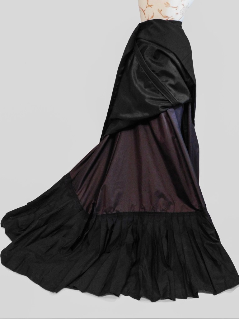 The main fabric is a thin wool whereas the underskirt is a very dark purple taffeta, stiff enough to support the outer train. I also made a dust lifter which ended up too lightweight and it constantly goes under the train of the outer skirt, so it’s useless. I should remake it with something sturdier.