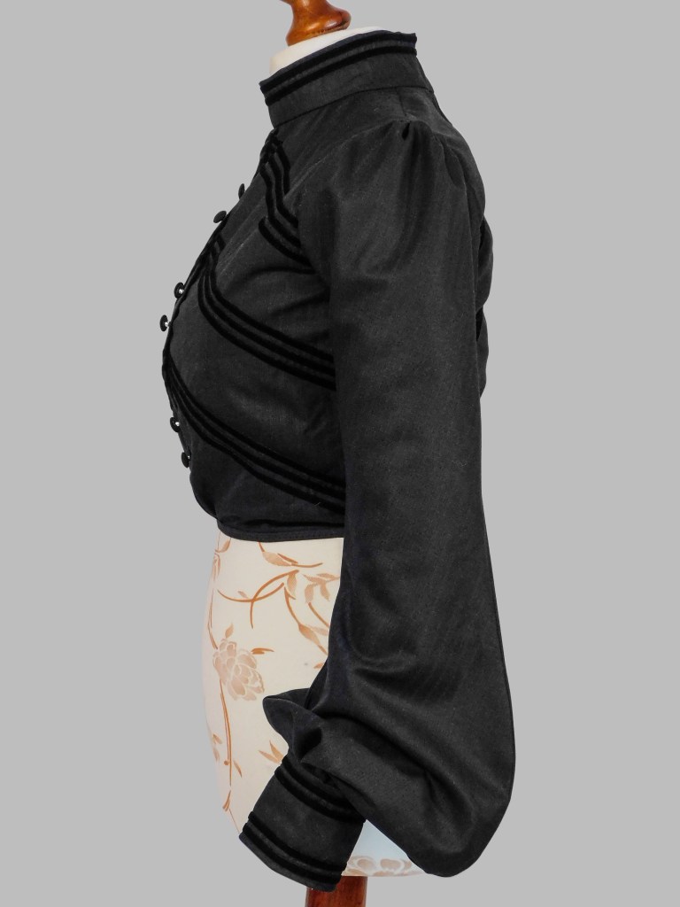 The back closes with hook and eyes whereas the front has a fake closure embellished with covered buttons. In order to make the bodice paired with the skirt, I used the skirt wool for the buttons and I also made a matching belt. The main problem with this project was that I had not enough black wool to make a complete mourning dress, for this reason I had to insert some elements here and there to pair the skirt.