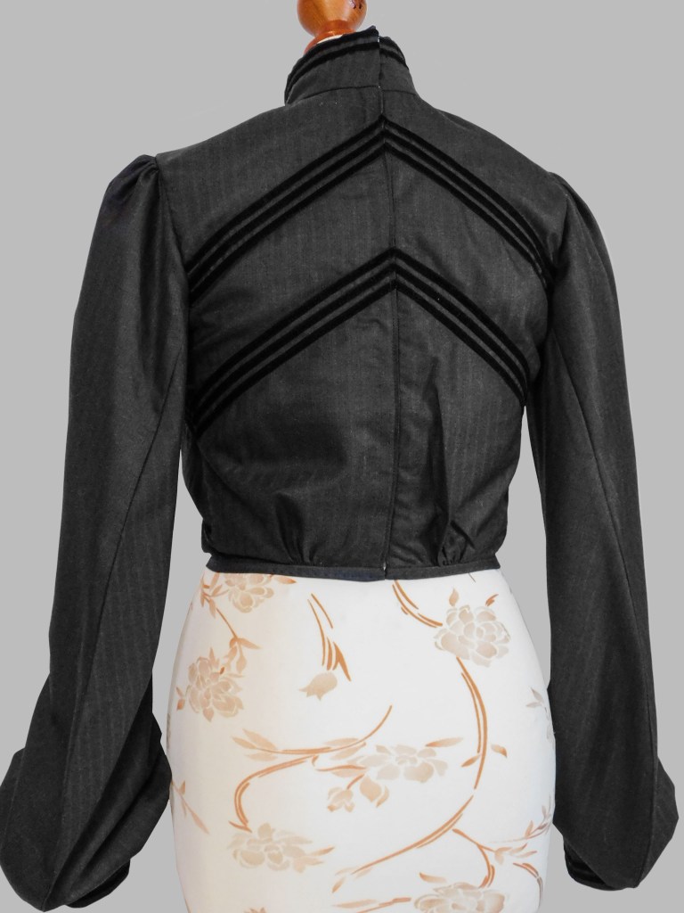 The inspiration behind this bodice is an illustration I found in my book Victorian Fashions – A Pictorial Archive dated 1903. It has, in fact, bishop sleeves and a very nice motif made with ribbons.