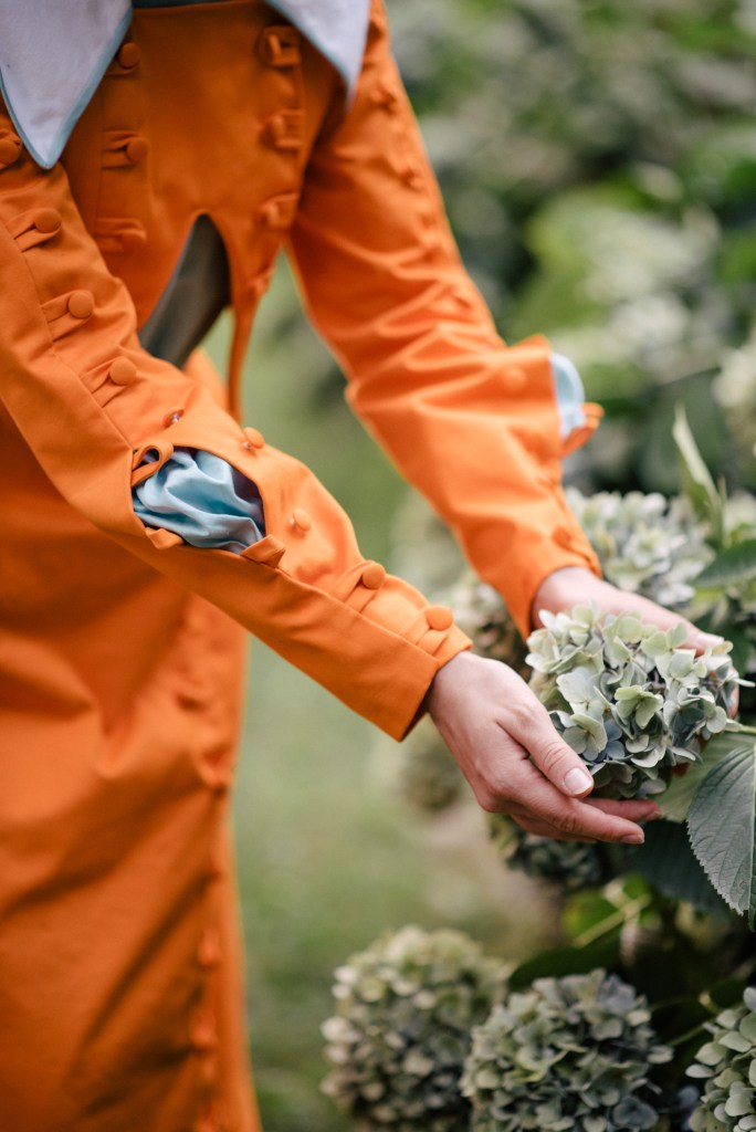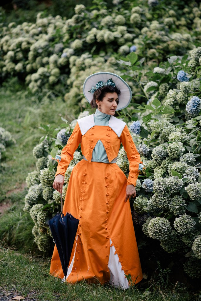 - The bodice: the bodice consists of a jacket (the orange one) and a vestee. I had to separate these two pieces since the fashion plated I was working with suggested that. The jacket was a challenge to make. I had some doubts about its construction and if could stand on its own without collapsing but at the end everything went well. The vestee instead was quite easy to make but a lot of hand sewing went into it: it opens on one side and it has a C.F. closure as well.