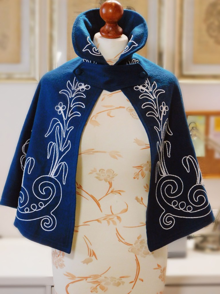This cape was quite a challenge to make since I found an online photo (just one!) of the front of the cape and nothing more. The resolution was also quite low so I had to guess how to continue the embroidery scheme on the sides by researching existing embroideries of that era, and I also had to guess the pattern.